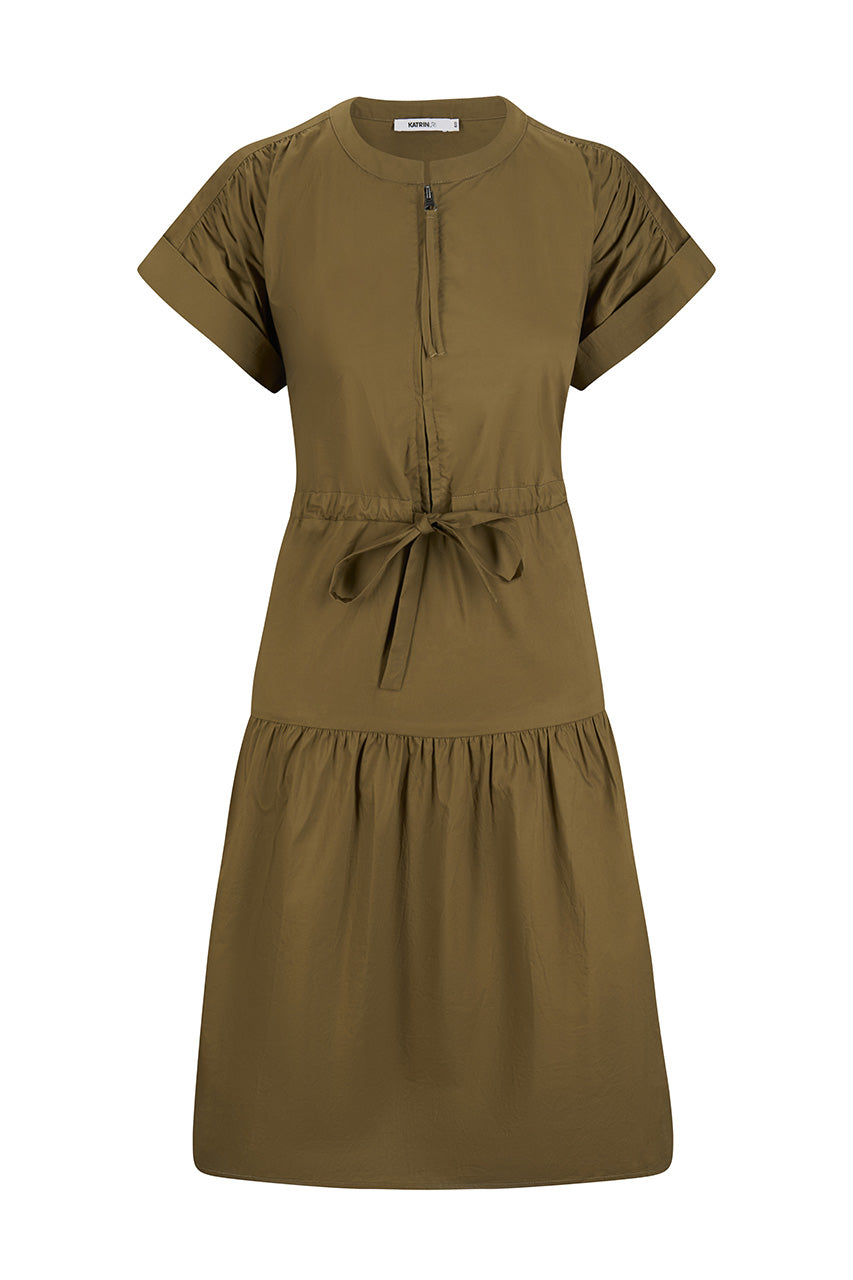 Kjolen har en feminin silhuett med markert midje og et lett utsvingt skjørt som skaper en flatterende form. Den diskré glidelåslukkingen i front gir et stilrent uttrykk og gjør kjolen enkel å ta av og på. Fargen Khaki gir et klassisk og anvendelig uttrykk som enkelt kan styles med både sneakers, sandaler eller hæler – avhengig av anledning.