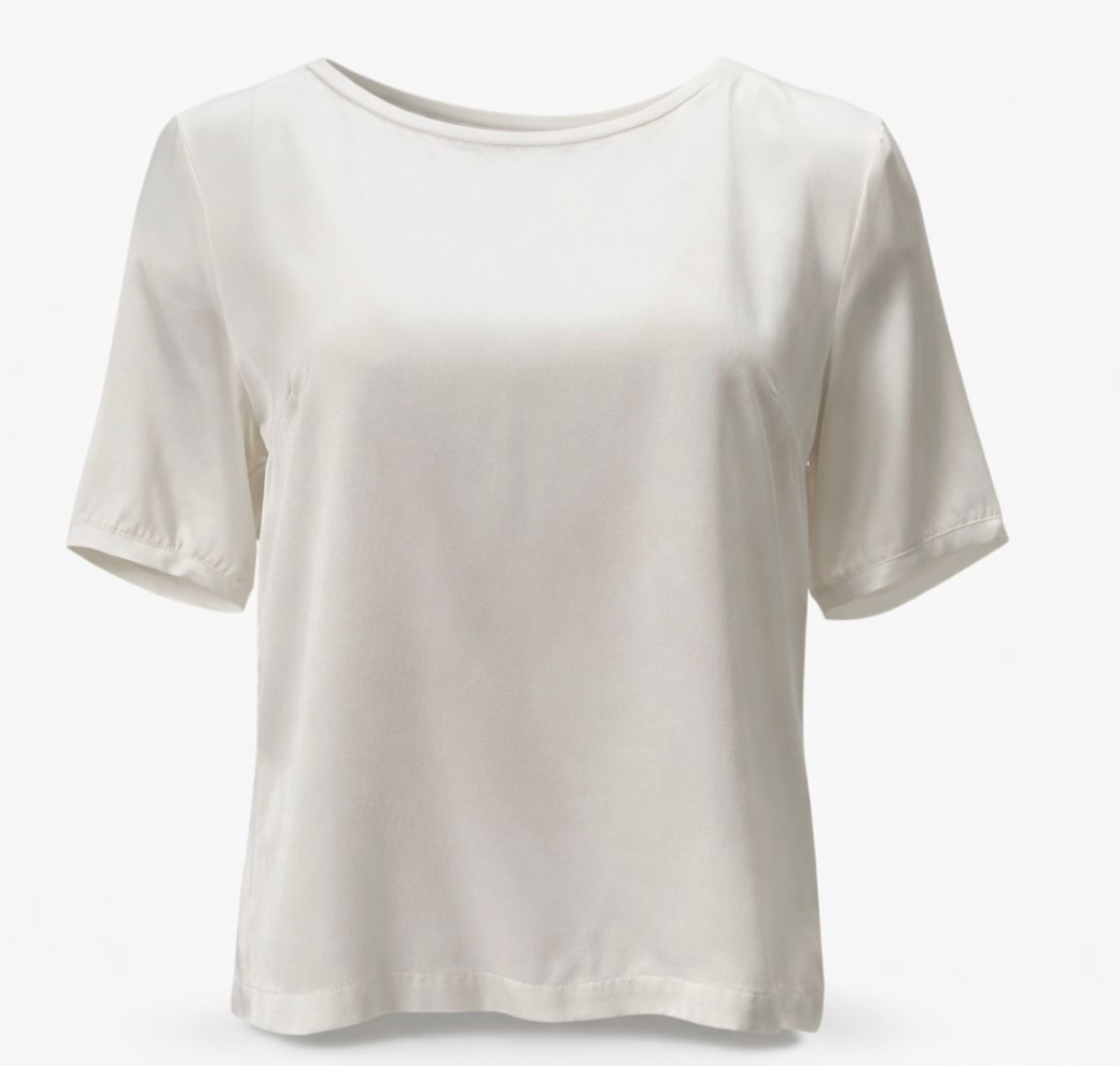 Toppen har en rund hals og korte ermer som gir et rent og feminint uttrykk. Den enkle silhuetten gjør den til et allsidig plagg som fungerer like godt til hverdags som til mer oppkledde anledninger. Den glatte fronten gir et elegant fall, mens designet gjør toppen komfortabel og lett å style.