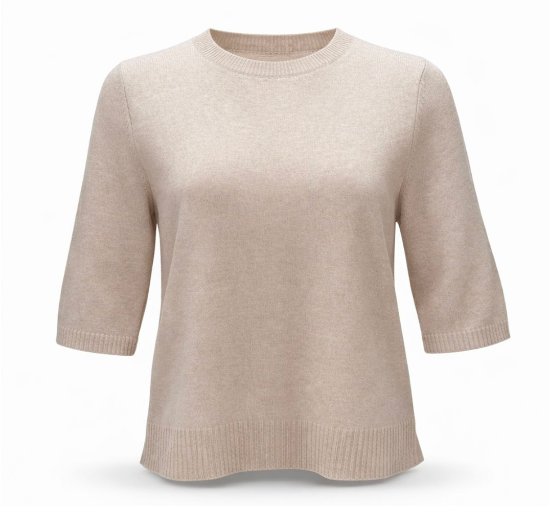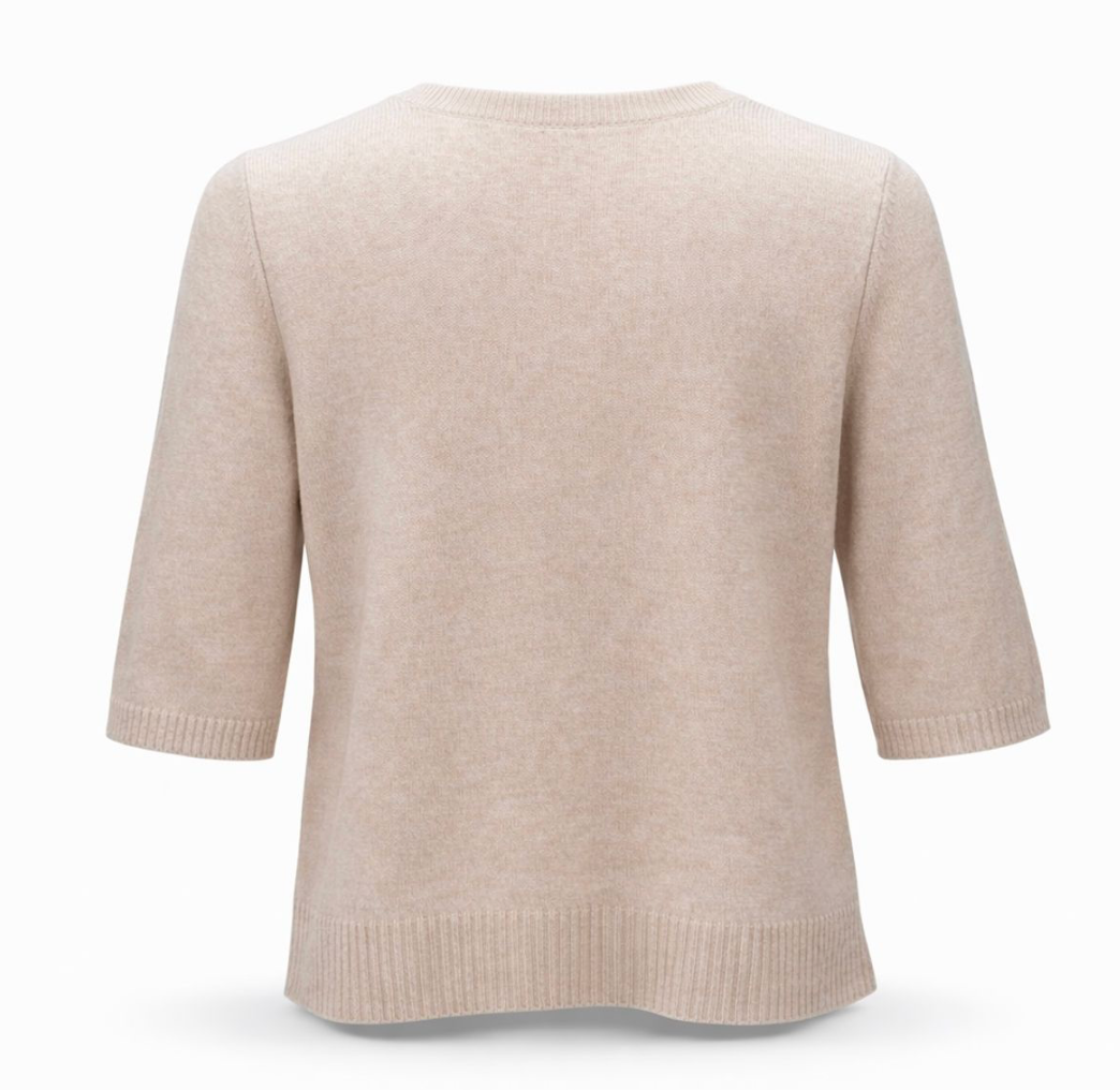 Toppen har en ren og stilfull silhuett med rund hals og korte ermer som gir et moderne og feminint uttrykk. De ribbestrikkede avslutningene ved hals, ermer og nederkant gir en raffinert finish og bidrar til et gjennomført design. Den enkle fasongen gjør den til et allsidig plagg som passer perfekt til både hverdagsbruk og mer oppkledde anledninger.