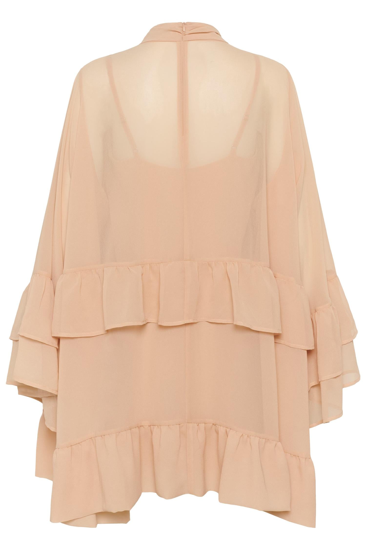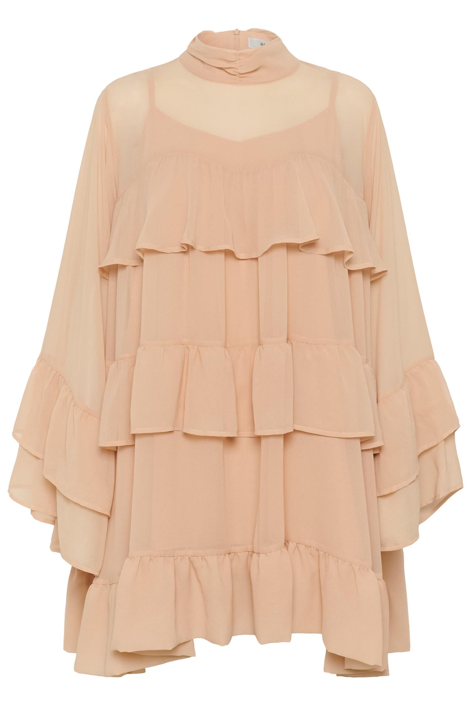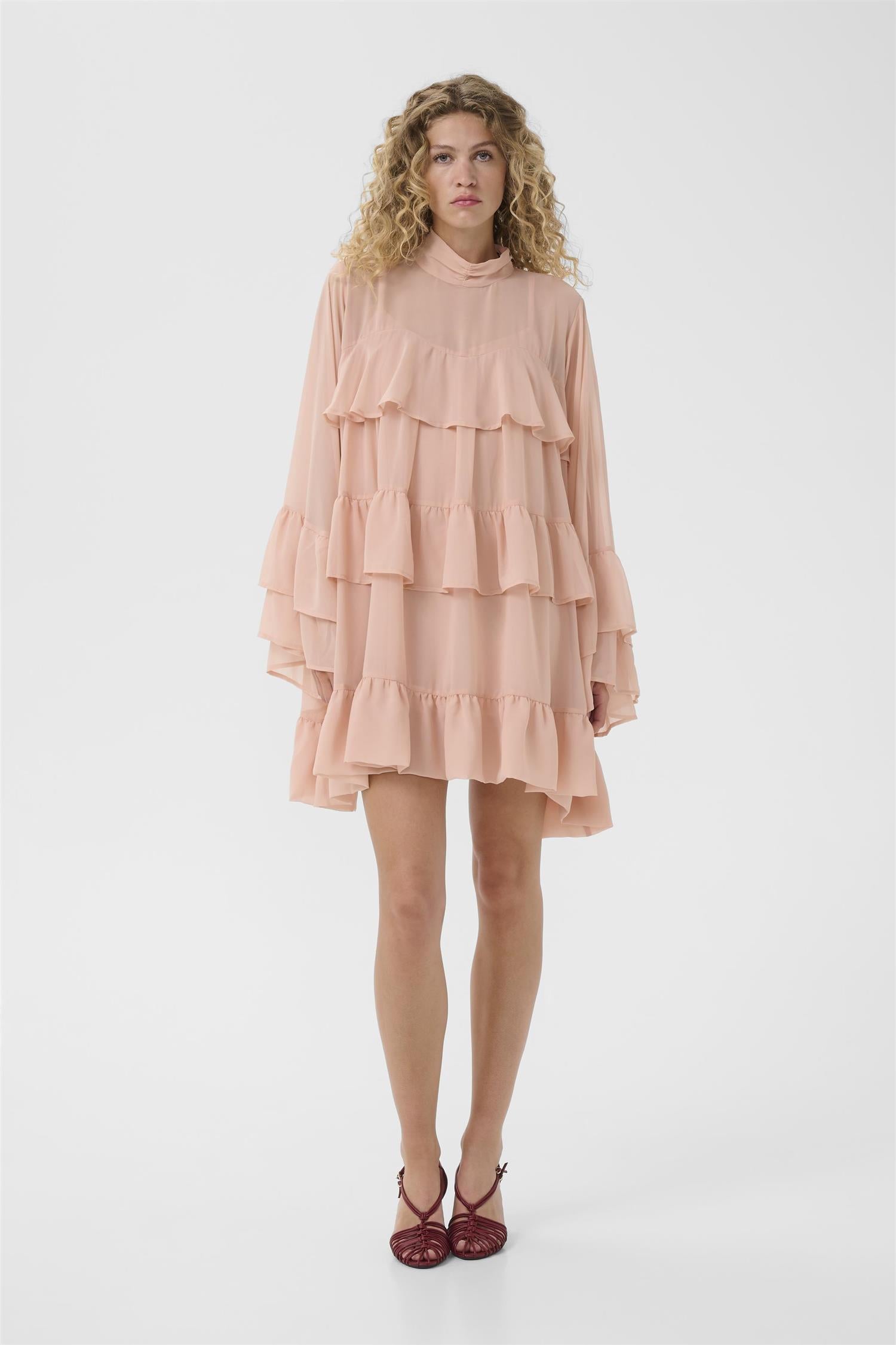 Kjolen har et luftig design med flere lag og dekorative volanger som skaper en lett og bevegelig silhuett. Den høye halsen gir et elegant uttrykk, mens de lange ermene med volangdetaljer tilfører et moderne og feminint preg. Den lagdelte strukturen gir kjolen et eksklusivt og stilfullt uttrykk som gjør den til et blikkfang i garderoben.
