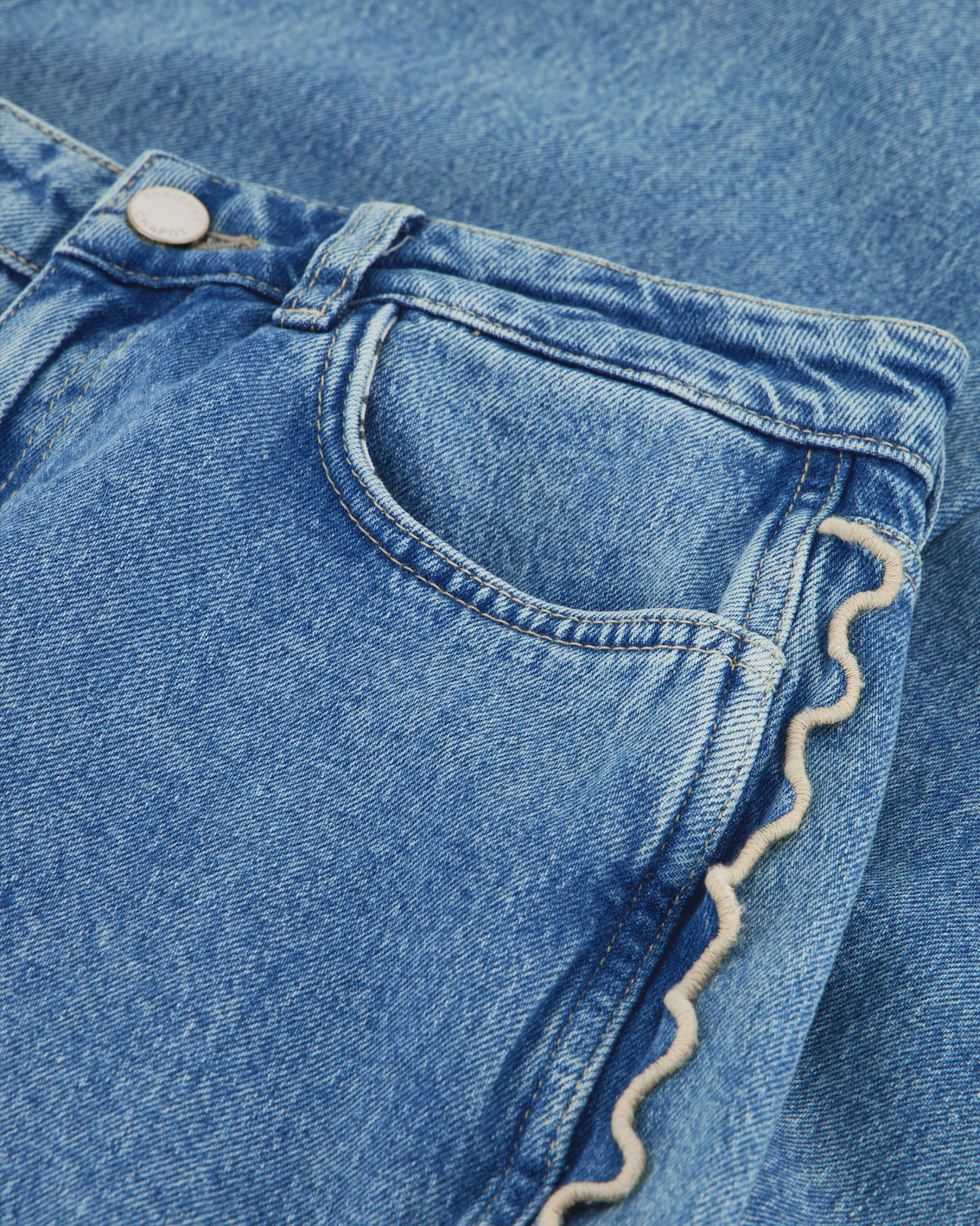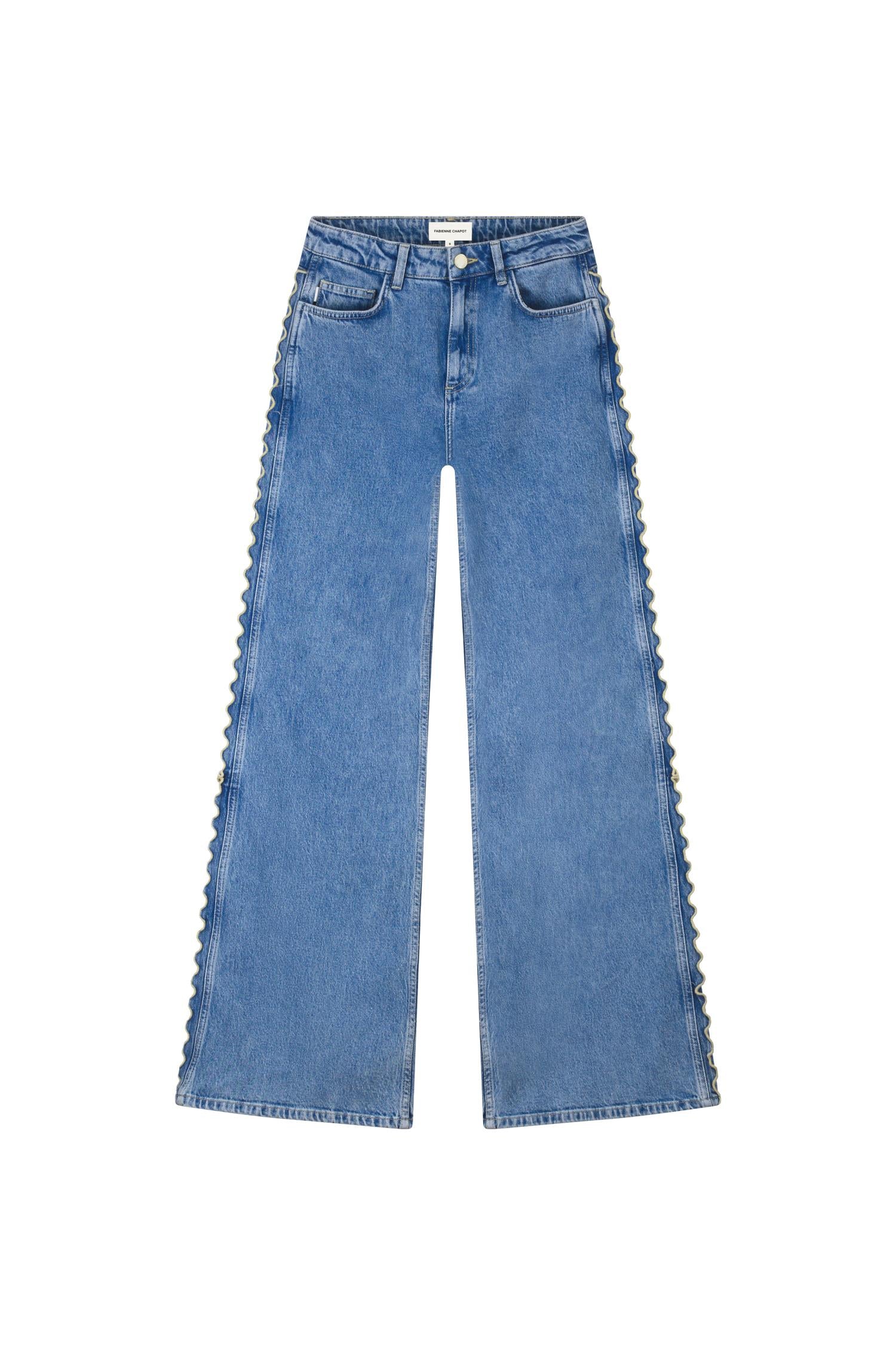 Den klassiske fargen Mid Blue gir jeansen et tidløst preg, mens de dekorative bølgedetaljene langs yttersømmen tilfører det lille ekstra. En statement-jeans som enkelt kan styles med både enkle topper, skjorter og strikk.