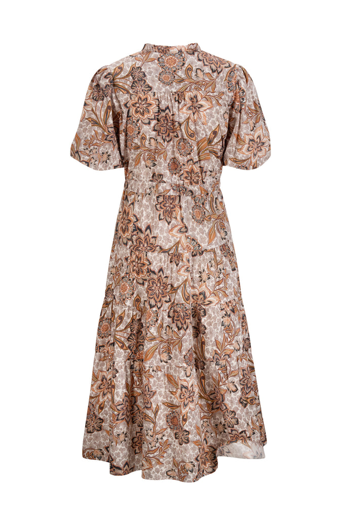 Beskrivelse: Florence Pia Dress er en nydelig og komfortabel kjole laget av en blanding av 97% bomull og 3% spandex. Denne kjolen kombinerer både stil og komfort med sitt blomstrete mønster i varme kaneltoner. Den elastiske midjen og det justerbare båndet gir en flatterende silhuett, mens de voluminøse ermene og den delikate v-halsen gir et feminint og sofistikert preg.