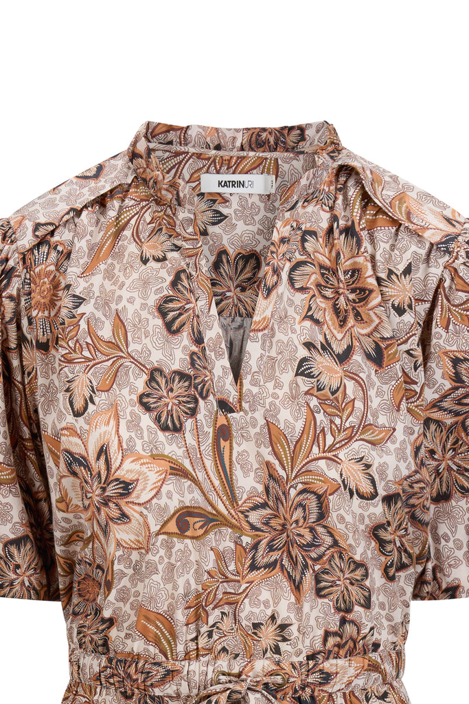 - Feminint design: Blomstrete mønster i varme kaneltoner, elastisk midje og voluminøse ermer.