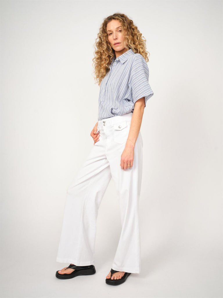 Disse hvite viddejeansene fra Mos Mosh har et klassisk og sofistikert snitt, og de brede beina gir en elegant og moderne silhuett. Med sine detaljerte lommer og sølvknapper, gir de et tidløst og stilrent uttrykk.