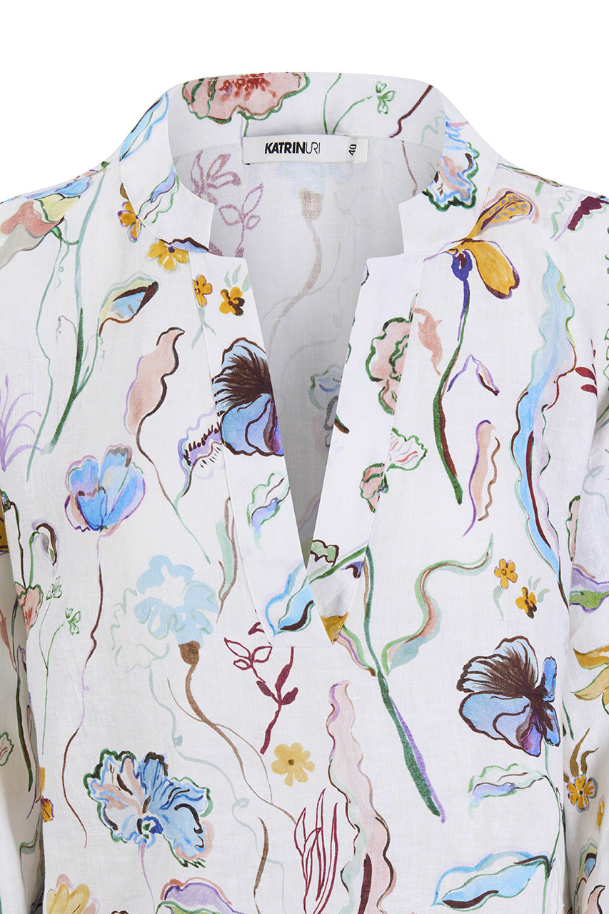 Katrin Uri Fantasy Sana Blouse er en lett og elegant bluse med et kunstnerisk blomsterprint som gir et friskt, feminint og eksklusivt uttrykk. Det delikate mønsteret kombinert med den luftige kvaliteten gjør blusen perfekt for både varme dager og lag-på-lag-antrekk gjennom sesongen.