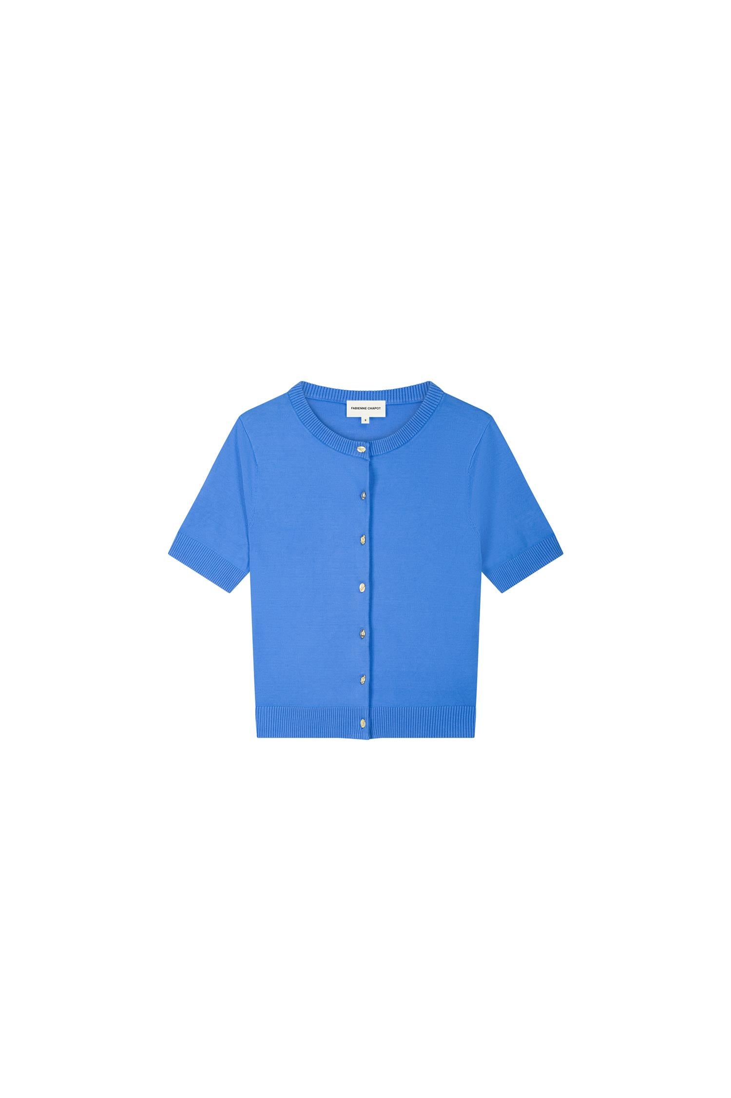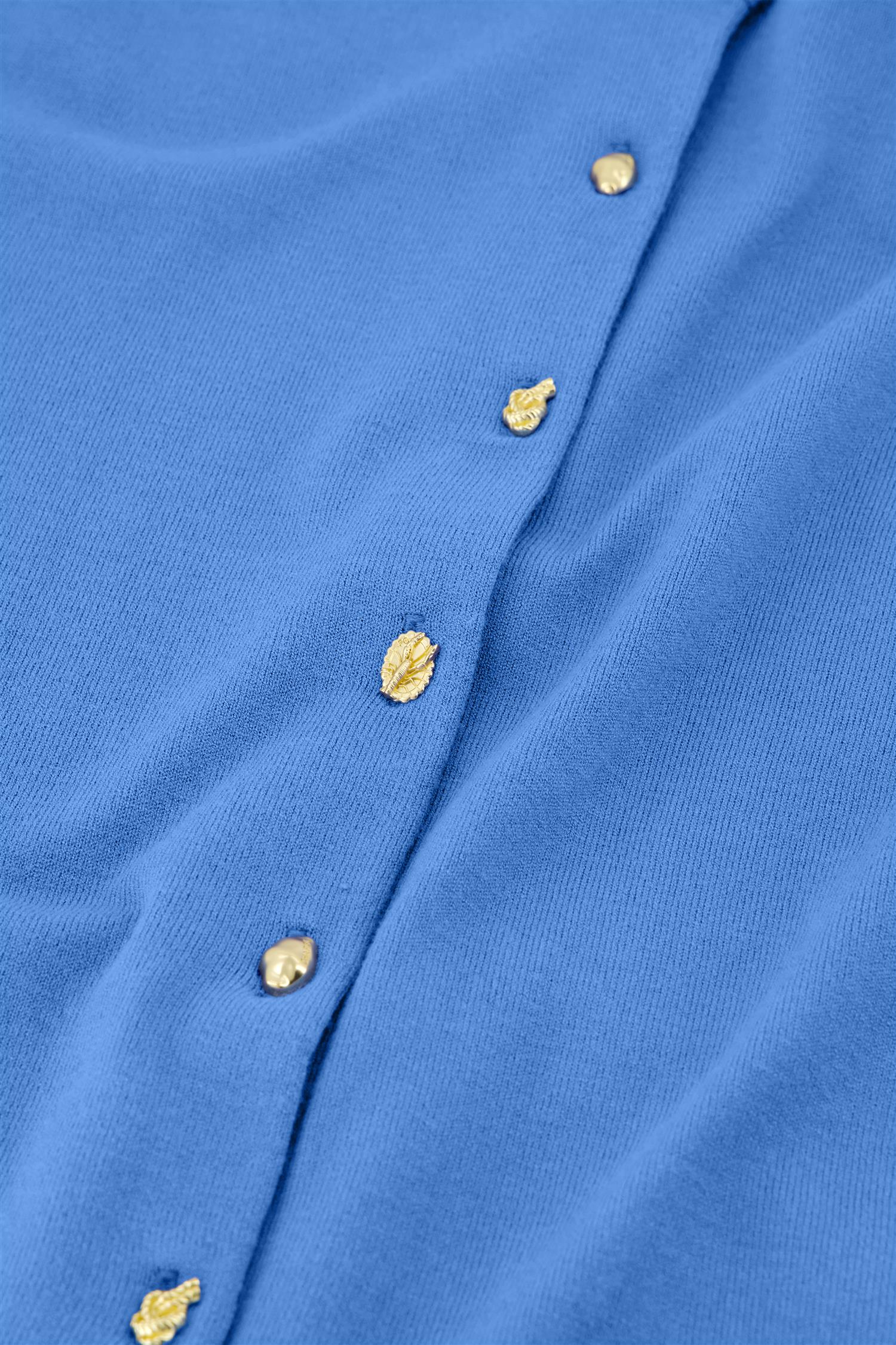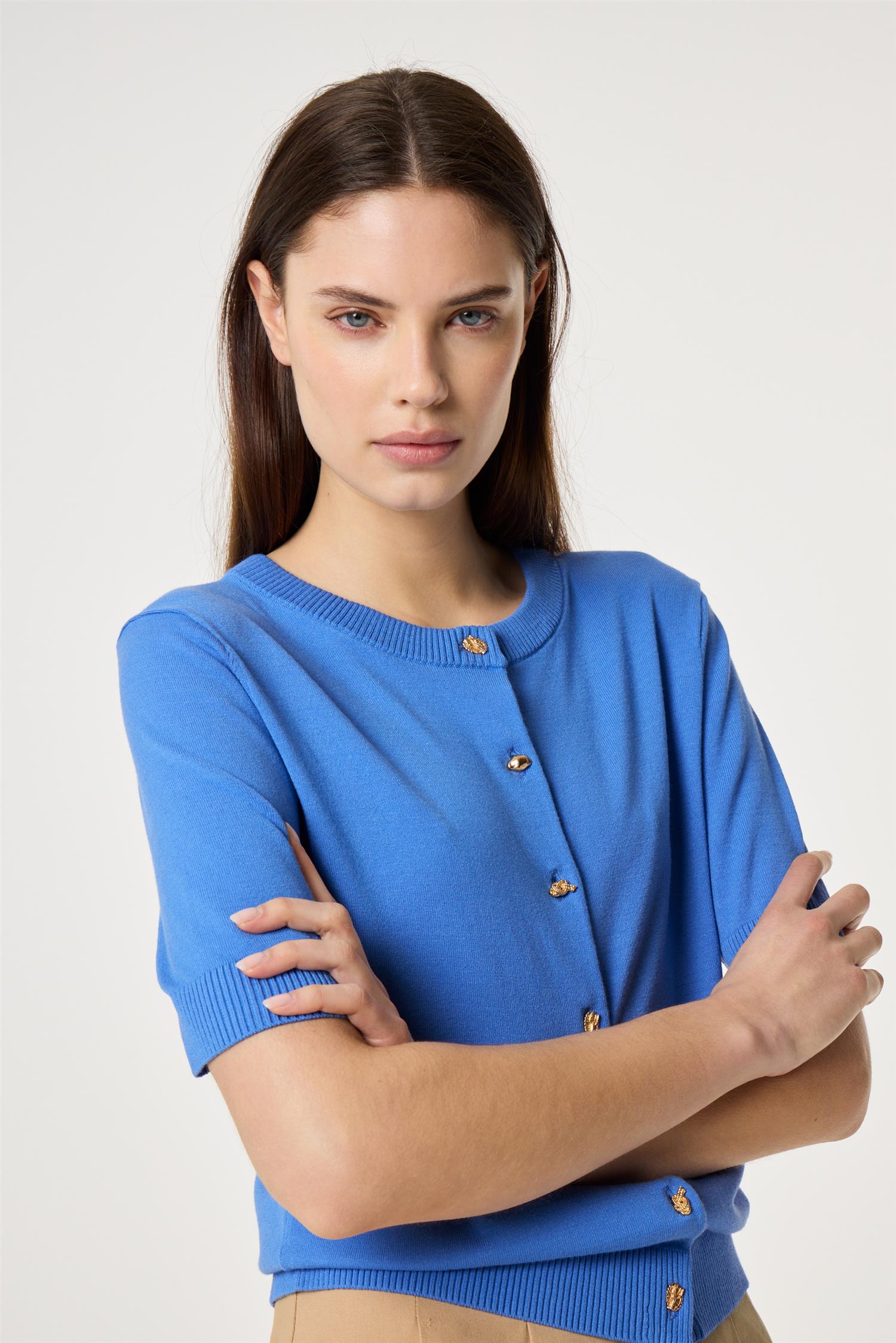Cardiganen har korte ermer og rund hals, noe som gjør den ideell for vår- og sommersesongen. De dekorative gullfargede knappene i front gir et eksklusivt og lekent uttrykk som er typisk for Fabienne Chapot. Ribbestrikkede kanter ved hals, ermer og nederkant sørger for en pen og gjennomført finish.
