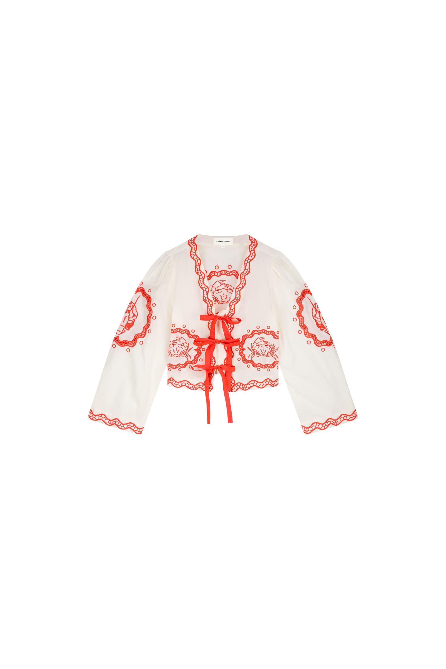 Blusen har dekorative broderier med bølgende kanter og blomsterinspirerte detaljer som skaper et eksklusivt og håndverksinspirert uttrykk. De markerte kantene og knytebåndene i front gir en leken og trendy finish, mens de lange ermene med broderte avslutninger understreker den feminine silhuetten. Perfekt til både jeans, skjørt eller linbukser for en gjennomført og stilfull look.