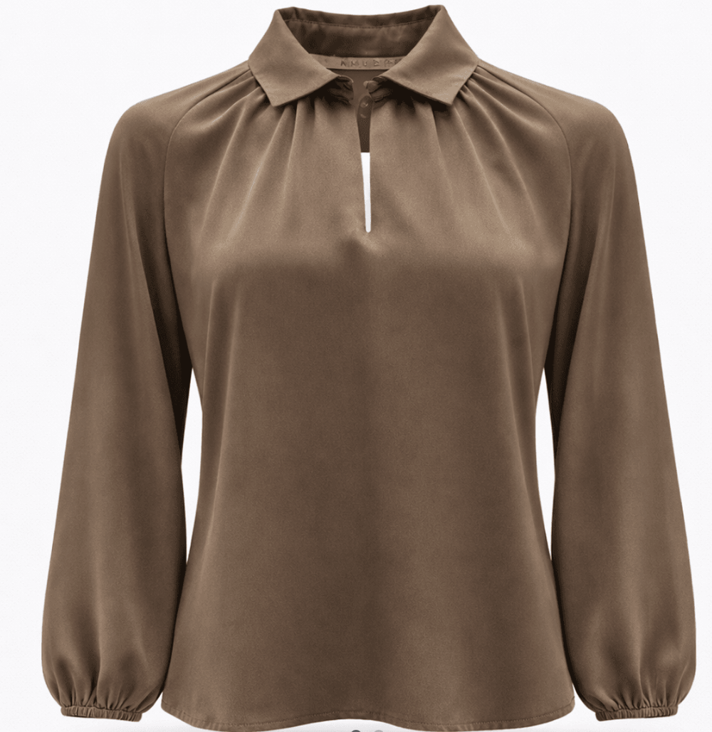 Blusen har en klassisk krage med en diskret åpning i front som gir et feminint og moderne uttrykk. De myke foldene ved halsen skaper et vakkert fall og tilfører designet en elegant detalj. Lange ermer med lett voluminøs form og elastisk avslutning ved mansjettene gir en balansert og stilfull silhuett.