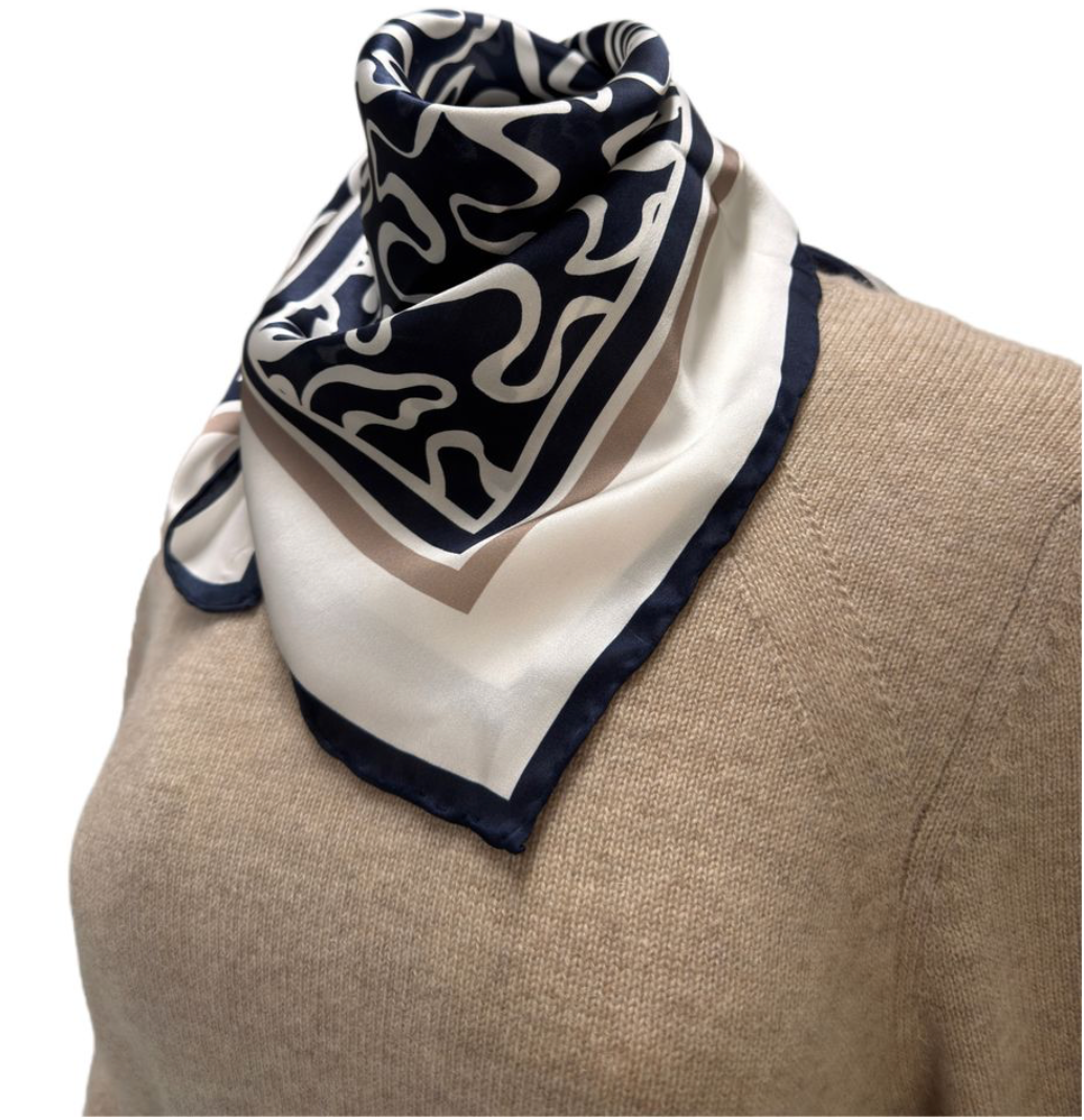 Skjerfet har et dekorativt design med kontrasterende kant som gir en raffinert finish. Den glatte overflaten og den lette kvaliteten gjør det enkelt å style på flere måter – rundt halsen, i håret eller knyttet på en veske for et gjennomført og personlig uttrykk.