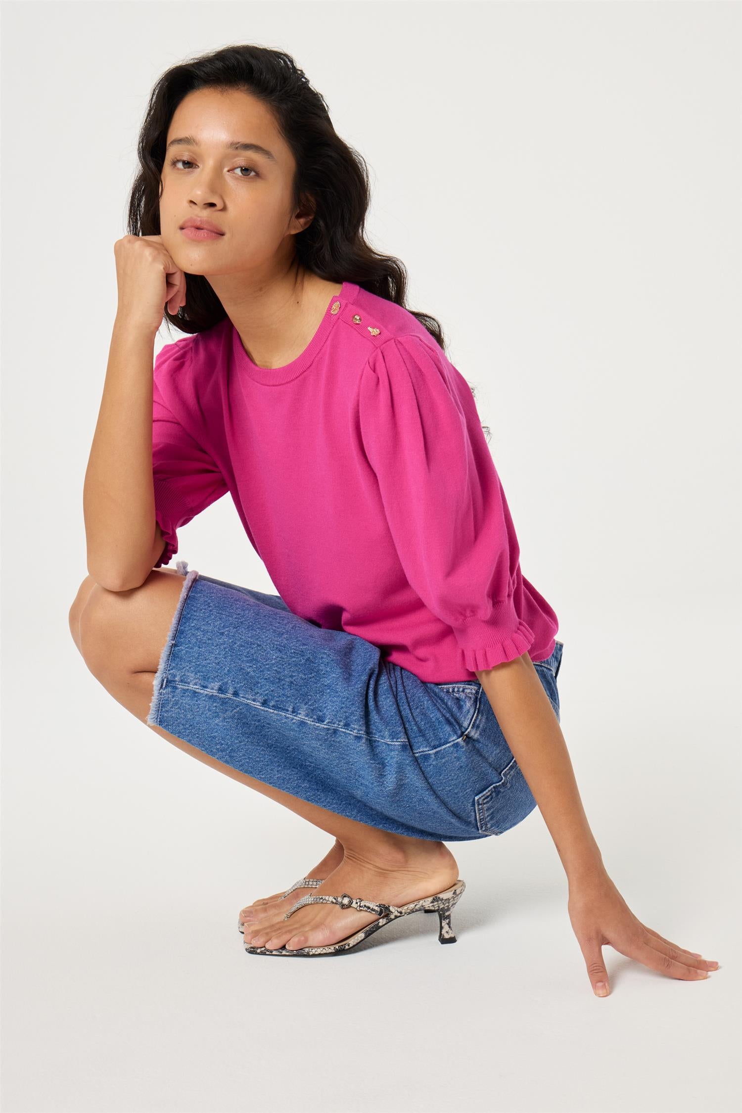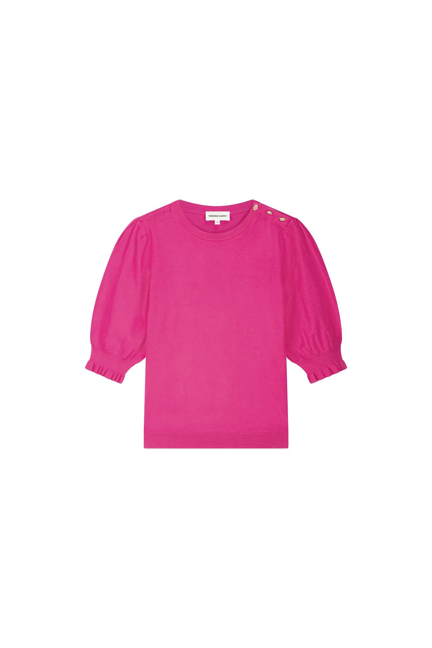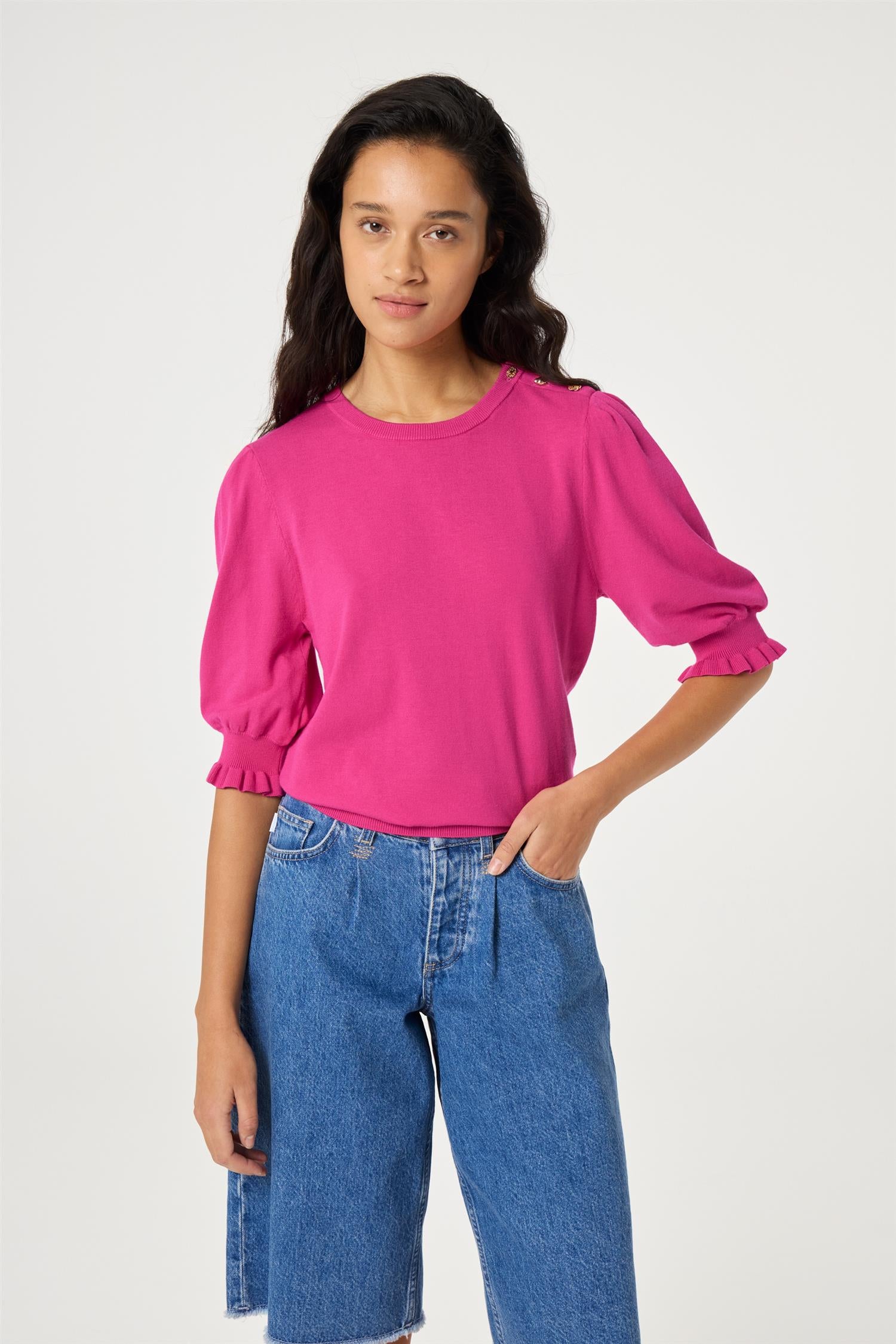 Toppen har en klassisk rund hals og korte puffede ermer som gir en elegant silhuett med en leken vri. De dekorative knappene på skulderen tilfører et eksklusivt preg, mens de ribbede avslutningene gir en fin struktur og komfort. Et allsidig plagg som enkelt kan styles både til hverdag og mer pyntede anledninger.