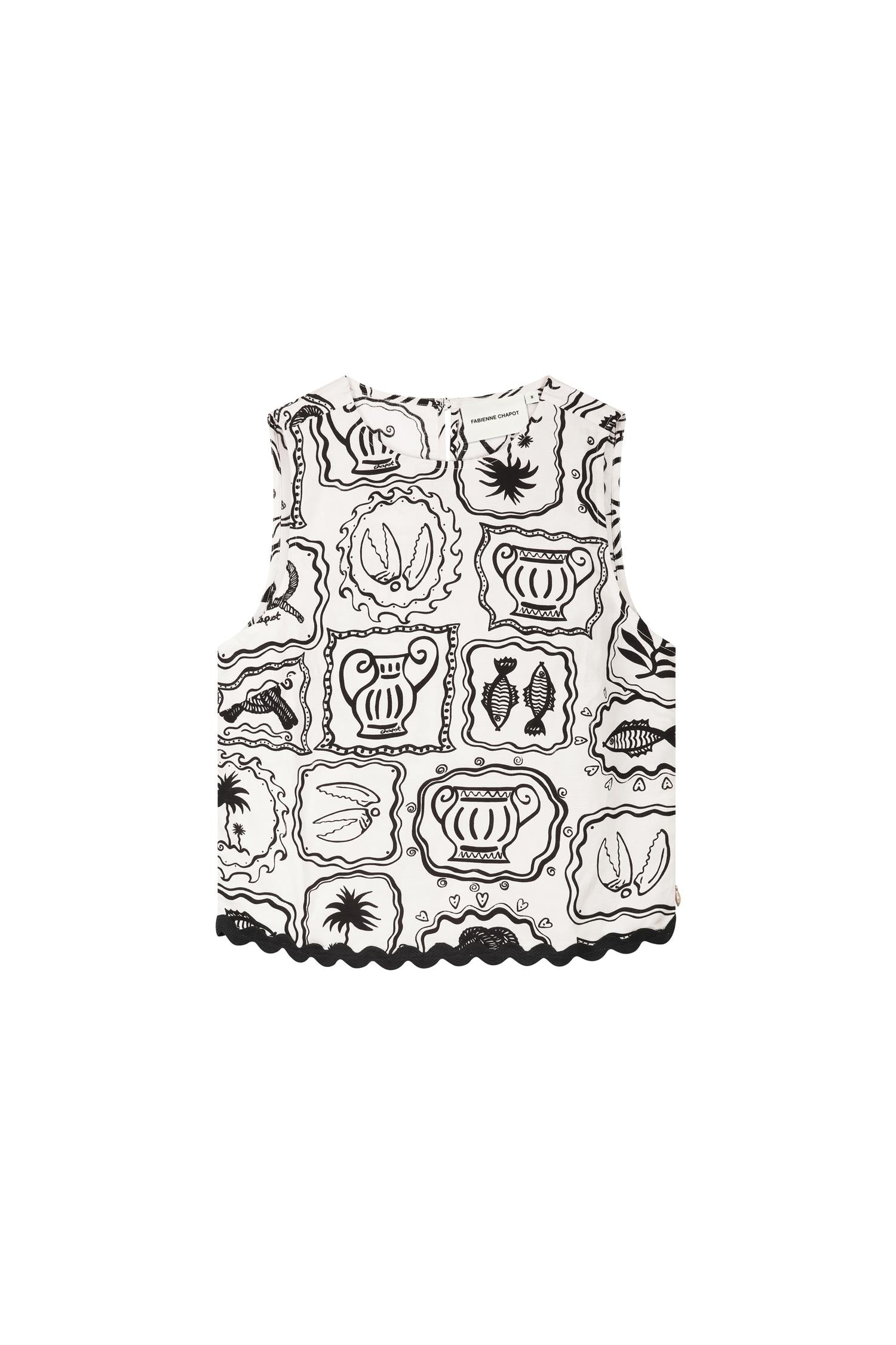Toppen har en ren, ermeløs fasong med rund hals som gir et minimalistisk og elegant uttrykk. Den bølgete kanten nederst tilfører en feminin detalj og skaper en myk avslutning på designet. Den lette kvaliteten gjør den behagelig å bruke, og perfekt for både varme dager og lag-på-lag styling.